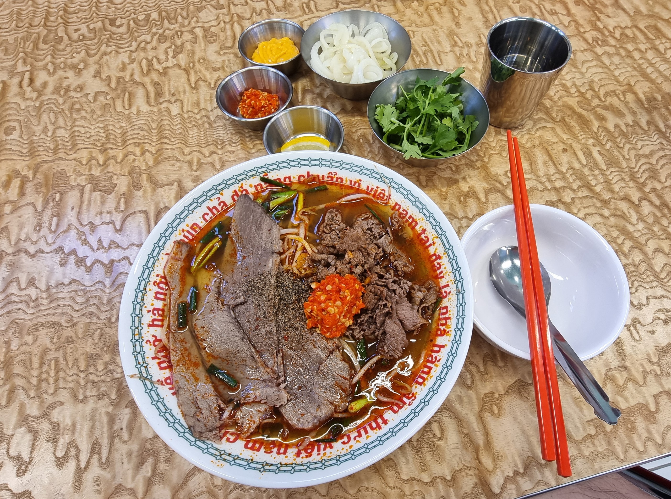 그런데 이 가게는 간판부터 하노이 오리지널이라고 떡하니 쓰여 있다. 위와 같은 이유로 별로 믿기지는 않았으나 와이프의 손을 잡고 조심스럽게 입장해 봤다. 사실 기대치는 크지 않았고 호기심이 더 컸던 것 같다. 쌀국수에서 하노이식을 으뜸으로 치는 이유가 쌀국수의 기원이 하노이에서 발현했기 때문이다. 우리나라 음식이 서울지방과 전라도 지방의 맛이 다르듯이 베트남에서도 마찬가지인데 베트남의 수도인 하노이 쌀국수는 소고기 육수의 맛을 강조한 오리지널의 느낌이 강한 반면 남부지방의 경제수도인 호치민의 쌀국수는 국물에서 달콤한 맛이 느껴진다. 개인적으로 달콤한 맛이 나는 쌀국수는 좋아하지 않아 호치민출장에서는 하노이식 쌀국수를 판매하는 집으로 해장을 하러 다녔었다. 하노이식 쌀국수가 베트남 로컬에서도 유명한데 호치민시에서도 하노이 쌀국수라고 판매하는 집이 있는데 반해 하노이에는 호치민식 쌀국수를 판매하는 가게를 본 적이 없기 때문이다.
