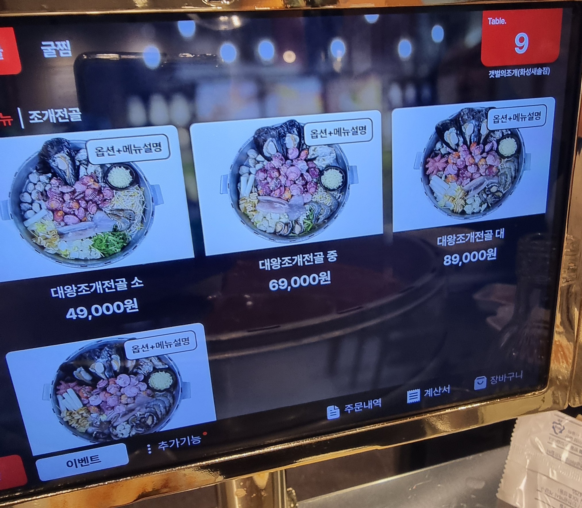 메뉴는 단출하다. 대왕조개전골이 메인이고 기타 석화류등이 있는데 이는 계절메뉴라 항시 맛볼 수 있는 것은 아니다. 가격은 대 사이즈가 8만 9천 원. 적은 가격은 아니다. 또한 국물을 매운맛과 개운한 맛으로 선택이 가능하다. 자극적인 우리 가족은 당연히 매운맛으로~
