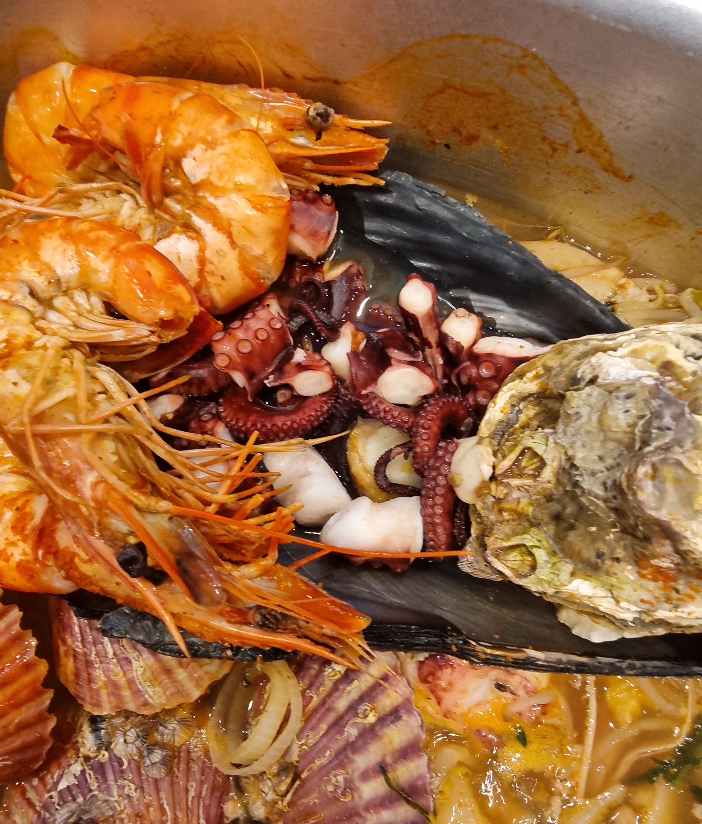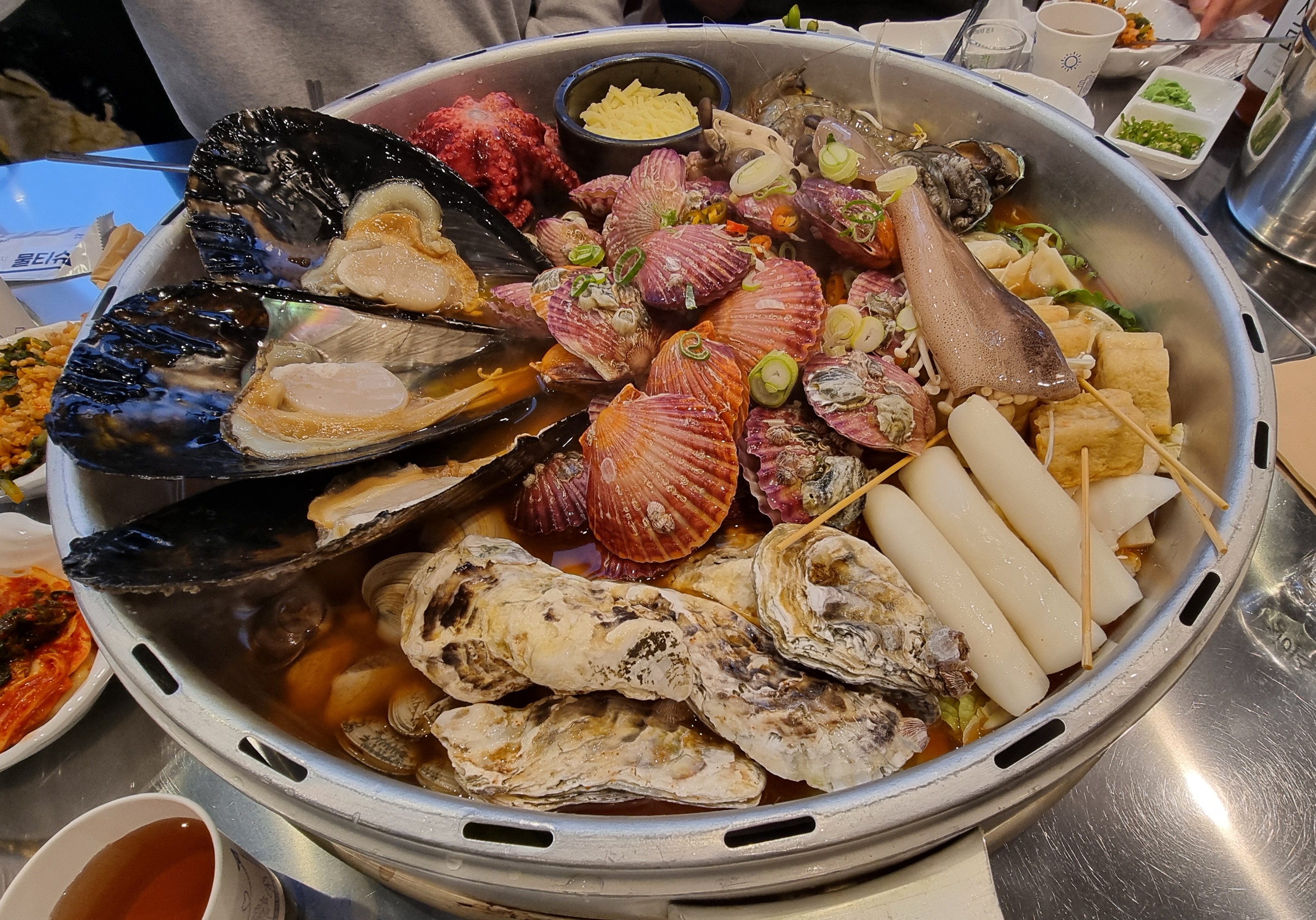 드디어 나온 대왕조개전골 큰 사이즈. 오징어 문어등 각종해산물과 다양한 조개류 그리고 전복과 찍어먹을 치즈도 모두 들어 있다. 깨알 같은 어묵과 떡사리는 덤이다. 외견상으로는 매우 푸짐해 보인다. 무엇보다 신선함이 생명인 해산물에서 신선도는 매우 좋아 보여 상당히 만족스러웠다. 참고로 저 석화를 먹을 때 껍질은 절대 앞쪽으로 열려고 하지 마시라. 석화의 뒤쪽을 숟가락을 사용하여 비틀면 쉽게 열린다.